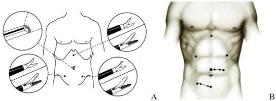 Fig. 13 - Pozitionarea trocarelor pentru hemicolectomia dreapta laparoscopica: