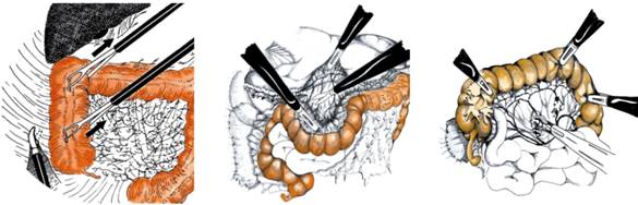 Fig. 14 - Hemicolectomia dreapta laparoscopica: sectiunea fasciei Toldt drepte (stanga); sectiunea epiplonului gastro-colic (mijloc); ligatura pediculilor vasculari ai colonului drept (dreapta) (9)