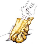 In mod obisnuit, se efectueaza o incizie oblica de 5 cm prin care se extrage colonul intr-un sac special. Marginile inciziei parietale trebuie protejate impotriva contaminarii.
