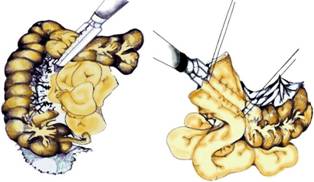 Se sectioneaza apoi ligamentul hepatico-duodeno-colic tractionand usor de marele epiploon si de colonul transvers. In continuare, se separa marele epiploon de extremitatea dreapta a transversului, cu atentie deosebita pentru hemostaza. Se sectioneaza apoi epiploonul gastro-colic (Fig. 14).