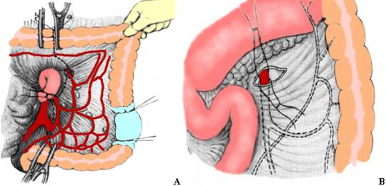 Fig.17 - Hemicolectomia stanga: A- delimitarea zonei de exereza colica cu izolarea tumorii si ligatura de la inceput a vaselor; B- ligatura venei mezenterice inferioare la marginea inferioara a pancreasului (8)