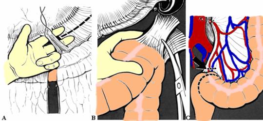 Fig. 18 - Hemicolectomia stanga: A- sectiunea epiploonului gastro-colic; B- sectiunea ligamentului suspensor al unghiului stang; C- ligatura vaselor hemoroidale superioare (1)