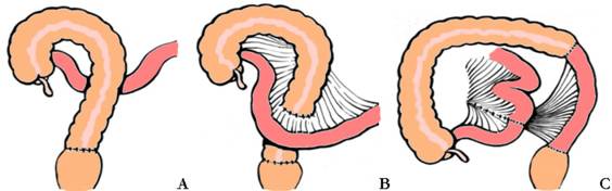Fig. 19 - Anastomoza transverso-rectala: A- dupa bascularea colonului drept; B- dupa coborarea transmezenterica a colonului transvers; C- dupa interpunerea unui segment de ileon (ileocoloplastie) (1)