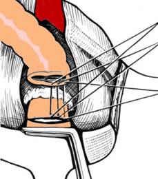 Fig. 20 - Hemicolectomie stanga cu anastomoza transverso- rectala termino-terminala manuala cu fire separate (planul posterior) (1)
