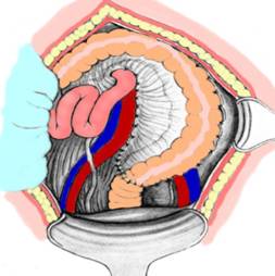 Dupa explorarea corecta si stabilirea deciziei operatorii, se creeaza campul operator optim prin pozitionarea mesei in usor Trendelenburg si exteriorizarea masei anselor intestinului subtire intr-un sac transparent special, care contine putin ser.