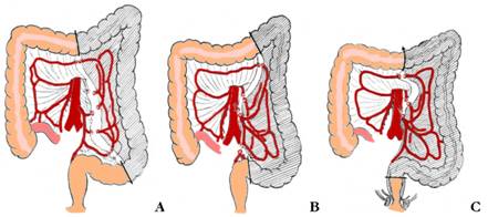 Fig. 22 - Hemicolectomie stanga: A- cu pastrarea arterei mezenterice inferioare si a colonului sigmoid; B-cu ligatura la origine a arterei mezenterice inferioare; C-rectohemicolectomie stanga (8)