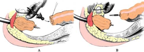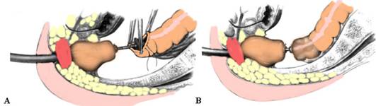 Alta varianta este anastomoza transsuturara care consta in inchiderea bontului rectosigmoidian cu un stapler liniar TA 55. Un stapler curb PCEEA este introdus transanal, dupa scoaterea nicovalei si inlocuirea cu un mandren, care va perfora peretele rectal la nivelul liniei de agrafare. Poate fi efectuata o bursa in jurul mandrenului. Staplerul circular (nicovala) este introdus in capatul terminal al transversului, pe care se realizeaza o bursa care se strange. Cele doua piese se ataseaza, se apropie capetele colice prin rotirea in sens orar a manerului staplerului pana la semnul marcat pe stapler, apoi se agrafeaza si se extrage staplerul (Fig. 25).