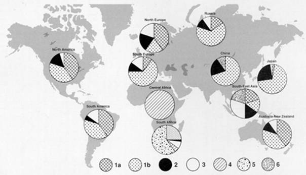 Variatia genotipurilor poate fi gasita, iar relative prevalente ale diferitelor genotipuri difera in functie de regiunea geografica.