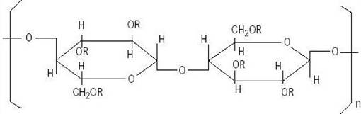 Fig. 11. Structura generala a eterului de celuloza. HPMC contine substituenti metoxi (CH3-O-) sau hidroxipropoxi (CH3CHOHCH2-O-)