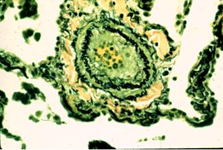 Alterari morfologice ale arterelor pulmonare (prin hipertrofie a FMN vasculare, muscularizare a unor vase non-musculare, inflamatie cronica, proliferare a intimei, fibroza excentrica intra- si peri-arteriala)
