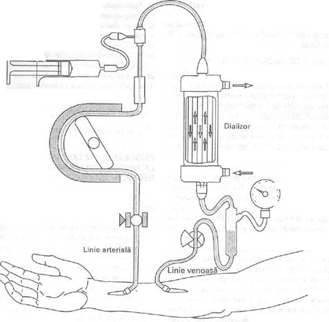 Hemodializa se realizeaza cu ajutorul aparatului de dializa. Rinichiul artificial este dializorul care realizeaza epurarea sangelui, aflat intr-un circuit extracorporal, de substante toxice dializabile, de origine endogena sau exogena realizandu-se totodata o corectare a tulburarilor hidro-electrolitice si acido-bazice prezente le pacientul cu boala cronica de rinchi.[4]