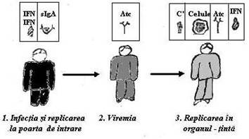 In forma sa obisnuita, infectia virala incepe cu invazia unuia dintre invelisurile epiteliale de granita: tegumente, mucoase respiratorii si digestive. Unele virusuri raman cantonate la acest nivel. Altele, se raspandesc in organism pe cale sanguina (faza viremica a infectiei) si se stabilesc in organele-tinta. Pe parcursul acestui traseu aceste virusuri expun Atg. proprii si amorseaza mecanismele de aparare nespecifica impreuna cu initierea raspunsului imun umoral. In cazul infectiei primare, Atc. virali se elaboreaza insa prea tarziu pentru a putea fi operativi.