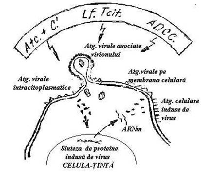 La comanda stimulilor virali celulele gazda pot fabrica proteine. Drept urmare, in celulele parazitate coexista atat Atg. virale codificate de genomul viral cat si Atg. celulare codificate de gene celulare activate de virus. Toata aceasta zestre de Atg., apare risipita in nucleu, in citoplasma sau pe suprafata celulei gazda. Atg. de suprafata codificate de celula gazda au potential redus de a induce raspunsul imun. In schimb, servesc clinicianului ca markeri care dezvaluie persistenta infectiei. Atg. virale exprimate pe suprafata celulei sunt insa imunogene. Raspunsul declansat de aceste Atg. este T-dependent. (Fig.43)