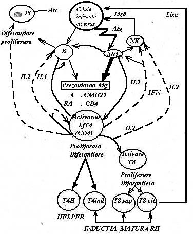 B = LfB; Mcf = macrofage; NK = celule 'natural killer'; T4h = LfT4 helper; T4ind = LfT inductor; T8sup= LfT8 supresor; T8cit = LfTh citotoxic; IL1-IL2= interleukina 1 si 2; IFN = interferon; FAB,FPB si FDB = factori de activare, proliferare si diferentiere ai LfB; Atg = antigen; RAtg = receptorul pentru Atg. al LfT; CMH = proteine de clasa II-a din complexul major de histocompatibilitate; CD4 = markerul LfT4