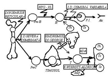 deficienta de ADA (adenozin dezaminaza). Absenta enzimei permite acumularea intracelulara a unor metaboliti (adenozina, AMP, ADP, ATP) si a derivatilor lor, care au efecte toxice asupra fenomenului de activare si de multiplicare ale LfT si B. ID care rezulta este severa si afecteaza ambele sisteme (humoral si celular). Pentru aceasta boala au fost imaginate 2 modele de terapie biologica specifica: administrarea repetata a enzimei, care intercepteaza adenozina difuzata in spatiul extracelular si o transforma in dezoxi-inozina netoxica si injectarea bolnavilor cu limfocite autologe in care s-a inserat o gena ADA normala (BLAESE si ANDERSON, 1990).