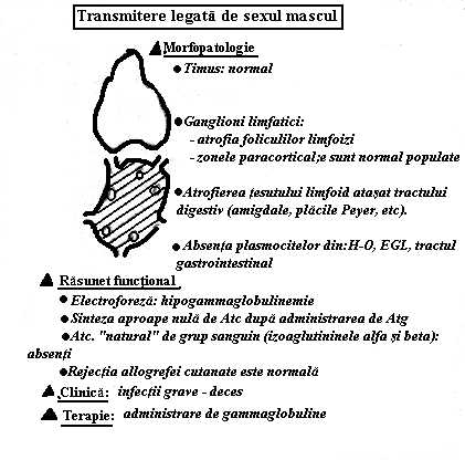 Fig. 63 Schema localizarii leziunilor celulare in cazul unor imunodeficiente primare HG-XL = hipogammaglobulinemie legata de sex (boala Bruton); ADA = adenozin-dezaminaza