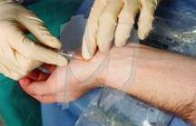 Medicul fizeaza artera intre degetele mainii stangi. Cand acul a patruns in artera, sangele, sub influenta presiunii sanguine, refuleaza in seringa, impingand pistonul, acul pulseaza sincron cu pulsul. Injectarea substantei medicamentoase se face foarte incet, altfel poate produce spasm arterial foarte dureros.