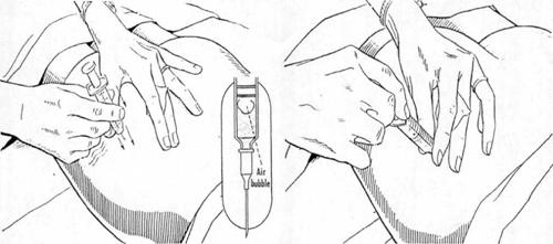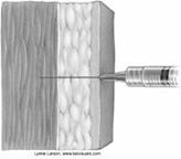 se inteapa perpendicular pielea patrunzand 4-7cm cu rapiditate, cu acul montat la seringa.