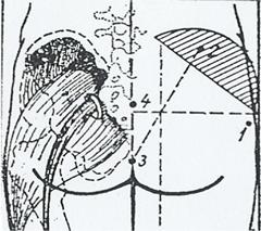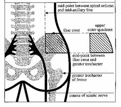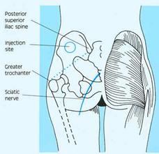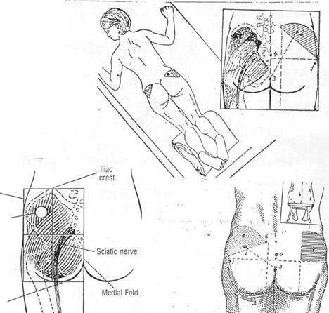 Pentru regiunea fesiera se imparte imaginar fesa in 4 si se injecteaza in cadrul latero-extern superior in triunghiul Scarpa.