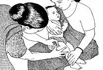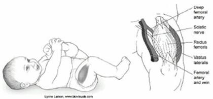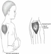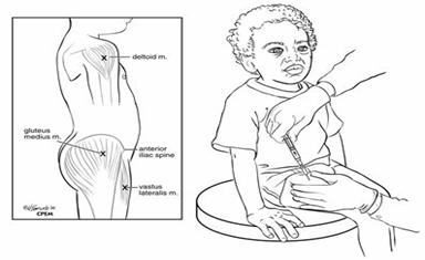 Pentru copii si sugari se face prin metoda "Crestei". Pacientul se afla in decubit lateral, capul va sta in stanga persoanei care injecteaza. Cu mana stanga se palpeaza marginea osoasa a crestei iliace, cu care se aseaza paralel degetul 2 al maini drepte. La dreapta degetului 2 se gaseste campul de injectare.
