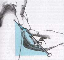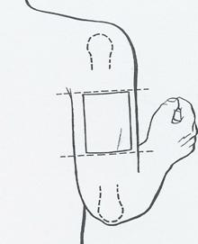 se cuteaza cu policele si indexul (aratatorul) mainii stangi o portiune mai mare de piele fixand-o si radicand-o de pe planurile profunde. Se va tine astfel pana la introducerea intregii cantitati (se evita astfel patrunderea intra musculara)