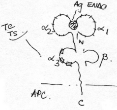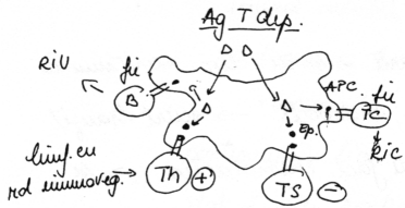 Legenda pentru figura 1: Antigenele timodependente sunt preluate de APC, apoi internalizate si prelucrate. In urma acestei prelucrari rezulta fragmente antigenice (epitopi) care vor fi expuse pe membrana APC in complex cu molecule MHC (n. ed. MHC tip II; Major Histocompatibility Complex type II). Sub aceasta forma epitopii sunt <prezentati> ambelor subvarietati de limfocite cu rol imunoreglator (Th, Ts), apoi epitopii sunt prezentati unei singure subvarietati de limfocite cu rol efector, fie B, fie T (n. ed. nu sunt prezentati ambelor subvarietati).