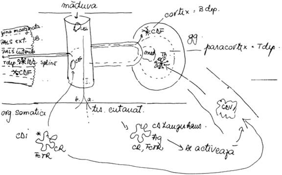 i. in ganglioni apoi in cortexul ganglionar, unde are loc transformarea in CDF;