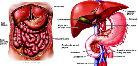 stomac si se definitiveaza in intestinul subtire, unde substantele nutritive sunt absorbite in capilarele sanguine si limfatice. La acest nivel in digestie intervin ficatul, pancreasul si un numar mic de glande din peretele intestinal. In intestinul gros resturile alimentare neabsorbite sunt condensate prin deshidratare, detoxificate prin conjugare, transformate in fecale prin fermentatie si putrefactie, transportate si eliminate la nivelul rectului si anusului.