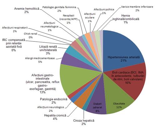 Patologia asociata colecistitei acute a fost destul de variata, existand o predominenta a hipertensiunii arteriale - 31,93%, bolilor cardiace (BCI, IMA in antecedente, tulburari de ritm, boli valvulare) - 23.39%, obezitatii -17.93%) si a diabetului zaharat (12,08%). Aceste boli determina o crestere a riscului anestezic si operator, influentand de asemenea, in mod negativ si evolutia postoperatorie.