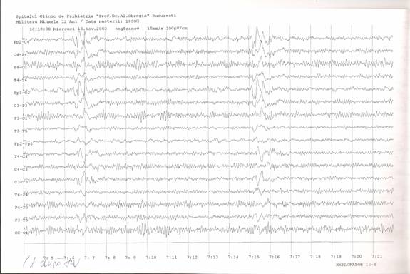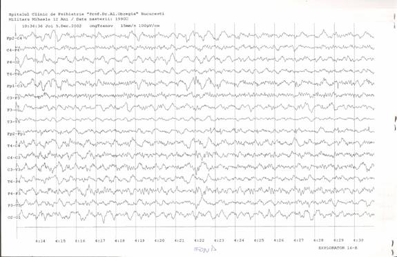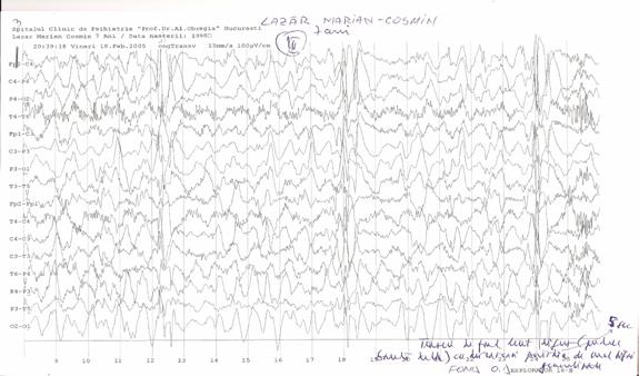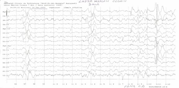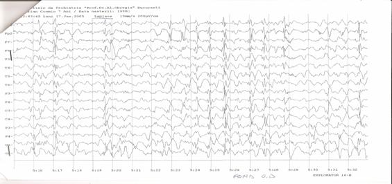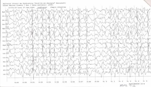 Fig. 3: EEG la o luna dupa diagnostic, timp in care a urmat tratamentul prescris. Agravarea simptomatologiei este insotita de inregistrarea unui traseu de fond lent difuz (predominant in banda delta), cu descarcari periodice, la 5 secunde, de unde trifazice generalizate.
