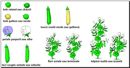 Mendel a incrucisat diverse soiuri de mazare, urmarind in descendenta sapte caractere (Figura 1), dintre care cele mai cunoscute sunt forma si, respectiv, culoarea bobului. Pentru fiecare din cele doua caractere, Mendel a constatat ca pot exista doua variante: