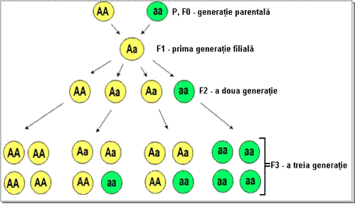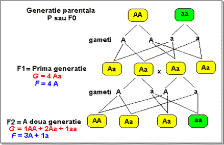 Daca se incruciseaza 2 organisme homozigote pentru un caracter (AA x aa), organisme ce difera intre ele printr-un singur caracter, in prima generatie (F1) rezulta numai organisme care din punct de vedere gentipic sunt heterozigote, iar din punct de vedere fenotipic prezinta fenotipul genei dominante (in cazul de fata A adica bob neted. Prin autofertilizarea organismelor obtinute in aceasta prima generatie, se obtin in generatia a doua (F2) organisme ce difera intre ele atat genotipic cat si fenotipic: