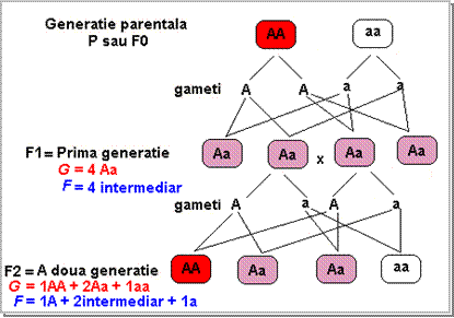 Figura 1.5 Prezentarea schematizata a monohibridarii prin incrucisarea la Mirabilis jalapa intre plante cu flori rosii (caracter dominant codificat de gena A) si plante cu flori albe (caracter recesiv codificat de gena a).