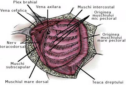 Lamboul axilar este retras in sus si fascia de pe marginea inferioara a marelui pectoral este excizata expunand dedesubt micul pectoral cu insertia sa coracoidiana. Se evita coagularea cu bisturiul electric in apropierea vaselor axilare si a perforantelor intercostale de la marginea laterala a sternului. Tesutul celular din vecinatatea venei axilare este incizat cu un foarfece fin expunand peretele venei in axul axilei.