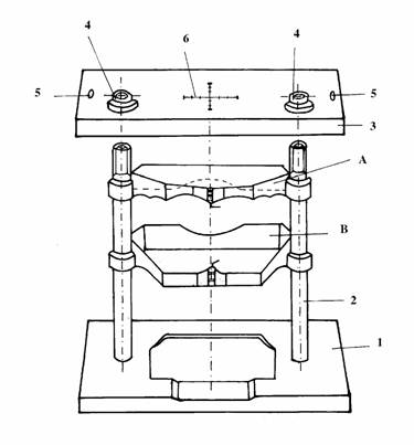 A- conformator superior; B- conformator inferior; 1-placa de baza inferioara; 2-culise verticale; 3-placa de baza superioara; 4-culise; 5- sistem de retentie; 6- mira de ghidaj (dupa Stanciu si Constantinescu).