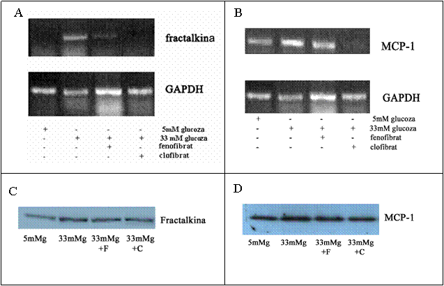 In continuare am folosit concentratia de glucoza la care am obtinut efect maxim (33mM). Celulele activate de glucoza au fost tratate cu activatorii de PPARa clofibrat si fenofibrat in concentratie de 100mM. Dupa 24 ore, celulele control, acivate si cele tratate cu fenofibrat si clofibrat au fost supuse tehnicilor de RT-PCR si Western blot. Astfel, am obtinut ca fenofibratul si clofibratul reduc semnificativ expresia genica a fractalkinei si a MCP-1 (figura 2, A si B) in celulele musculare netede activate cu glucoza crescuta. Rezultatete obtinute la nivel de expresie genica au fost confirmate de cele obtinute la nivel de expresie proteica. Astfel, expresia proteica a fractakinei si MCP-1 in omogenat celular total au fost reduse de fenofibart si clofibrat (figura 2, C si D).