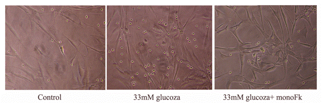 In cazul experimentelor de adeziune in conditii de flux laminar, putem observa (figura 4) ca numarul monocitelor care adera la CMN activate timp de 24 ore cu glucoza crescuta este de 4 ori mai mare decat numarul monocitelor aderate la CMN control. Astfel, procesul de aderare al monocitelor in conditii de flux laminar la CMN activate de glucoza este mult crescut comparativ cu adeziunea in conditii statice. Incercand sa extrapolam aceste rezulatate la conditii in vivo, putem presupune ca in cazul expunerii CMN fluxului de sange hiperglicemic (cand poate sa apara asa-numitul proces de de-endotelializare datorita unei leziuni), are loc un proces crescut de adeziune a monocitelor.