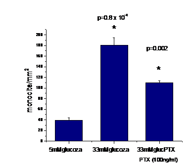 De asemenea, pentru a urmari rolul chemokinelor in acest proces de aderare in flux laminar continu, am incubat CMN cu pertussis toxine (PTX, 100ng/ml), o toxina care inhiba semnalizarea receptorilor chemokinici, transformand receptorul in unul nefunctional. Dupa cum putem vedea, inhibarea receptorilor chemokinici de catre toxina pertussis, reduce semnificativ adeziunea monocitelor la CMN activate de glucoza, dovedind rolul chemokinelor in procesul de adeziune. Pentru ca adeziunea monocitelor nu a fost redusa la nivel de control de catre PTX, putem presupune ca adeziunea este dependenta si de moleculele de adeziune care sunt supra-exprimate de glucoza crescuta, dupa cum am demonstrat in primul capitol al acestei lucrari.