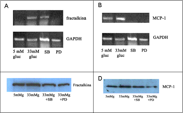 Exista multe studii care arata ca activarea PKC, PTK, MAPK, si NF-kB pot fi implicate in producerea chemokinelor. Astfel, am presupus ca unele din aceste cai de semnalizare pot contribui la expresia chemokinelor indusa de glucoza crescuta in CMN. Mai intai CMN au fost pretratate cu PD 98059, 20 μmol/L (inhibitor al ERK1/2) si cu SB 203580, 10 μmol/L (inhibitor al p38 MAPK).