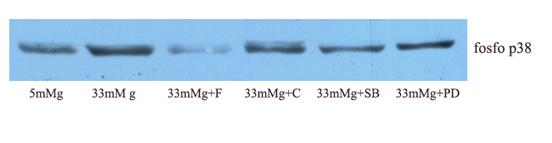 In studiul nostru am urmarit efectul glucozei crescute asupra fofso-protein kinazelor ce apartin cailor ERK1/2 si p38MAPK, pentru a gasi modul in care glucoza induce expresia MCP-1 si a fractalkinei.. De asemenea, pentru determinarea modului de actiune al fenofibratului si clofibratului, am testat efectul acestora asupra activarii fosfo protein kinazelor (pERK1/2 si p-p38MAPK).