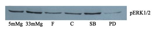 In cazul fosfo ERK, concentratia mare de glucoza induce fosforilare crescuta a acestei MAPK. Fenofibratul si clofibratul reduc fosforilarea ERK, astfel ca efectul anti-inflamator al acestor medicamente poate fi datorat inhibarii cailor de activare ale MAP kinazelor. Dupa cum era de asteptat, (figura 8) inhibitorul de p38MAPK nu are efect asupra pERK1/2, iar inhibitoul de ERK1/2 (PD 98059) inhiba de tot forma fosforilata a ERK1/2.