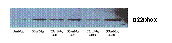 Pentru a determina mecanismul de activare al NADPH oxidazei de catre glucoza crescuta, am urmarit efectul acesteia asupra doua din subunitatile NADPH oxidazei. Rezultatele obtinute arata ca glucoza activeaza subunitatea p22phox a NADPH oxidazei, iar fenofibratul si clofibratul scad espresia acesteia (figura 10, A). De asemenea, inhibitorul de ERK1/2 dar nu de p38 MAPK reduce expresia p22phox. In contrast, subunitatea p67 a NADPH oxidazei nu este modificata semnificativ de glucoza crescuta (figura 10, B). Desi clofibratul induce o scadere aparenta a acestei subunitati, efectul nu este semnificat In literatura de specialitate activarea subunitatii p22phox este echivalenta cu activarea NADPH oxidazei, in timp ce subunitatea p 67phox pare sa fie o subunitate ne-esentiala a NADPH oxidazei. Astfel, putem conclude ca nivelele crescute de glucoza induc crsterea expresiei p22phox si astfel activarea NADPH oxidazei, iar medicamentele inhiba activarea NADPH oxidazei prin scaderea expresiei proteice a a cestei subunitati.