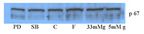 Investigarea expresiei proteice a diferitelor protein kinaze s-a facut in omogenate celulare obtinute prin lizarea CMN aflate in diferite conditii experimentale cu tampon de liza specific pentru fosfo proteine. Tamponul de liza folosit este alcatuit din: 50mM HEPES, 5mM EDTA, 50mM NaCl, 1% Triton, pH 7.4, continand inhibitori de proteaze (10mg/ml aprotinina, 1mM PMSF, 10mg/ml leupeptin) si inhibitori de fosfataze (50mM fluorid de sodiu, 1mM ortovanadat de sodiu, 10mM pirofosfat de sodiu). Proteina nucleara (50μg) a fost analizata in gel de poliacrilamida (10% SDS-PAGE) iar experimentele de Western Blot au fost efectuate cu ajutorul anticorpilor monoclonali specifici fiecarei proteine testate si anticorpi secundari corespunzatori. Benzile proteice din membrana de nitroceluloza au fost evidentiate cu ajutorul kitului luminescent ECL si densitometrate cu softul Total Lab 1.11 de la Pharmacia.
