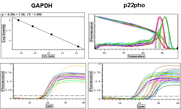 Experimentele de Real Time PCR au fost efectuate pentru a urmari efectul glucozei crescute asupra subunitatii p22 a NADPH oxidazei. Cuantificarea subunitatii p22phox a NADPh oxidazei s-a facut prin amplificarea cDNA folosind un termociclu real-time Opticon 2 DNA (MJ Research). Conditiile de amplificare optimizate au fost: 0.4mM pentru fiecare primer, 4mMMgCl2, si temperatura de annealing la 65 C si de extensie la 72 C, timp de 40 cicluri. Cuantificarea relativa a fost facuta folosind metoda comparativa CT, gena GAPDH fiin folosita ca un control intern.