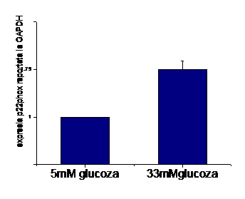 In continuare am determinat expresia genica a subunitatii p22 phox. Astfel am facut analiza cantitativa a expresiei genice a p22phox (figura 5) prin real time PCR si rezulatele confirma pe cele obtinute la nivel de proteina, expresia genica a subunitatii p22 fiind crescuta de concentratia de 33mM glucoza.