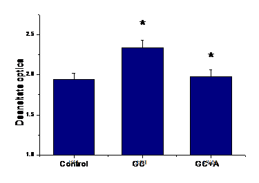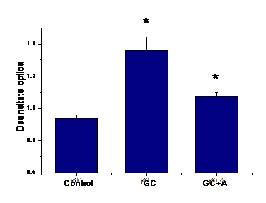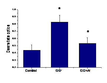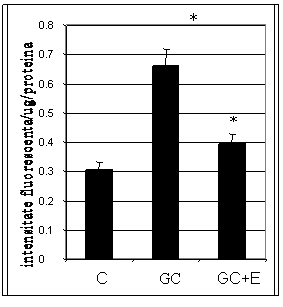 Acumularea intracelulara de ROS a fost evaluate prin fluorimetrie, cu ajutorul 2',7'-diclorofluoresceinei diacetata printr-o metoda descrisa anterior de [Hempel et al., 1999; Zang et al., 2000]. Colorantul (nefluorescent) (DCFH-DA) este permeabil in celula endodeliala; in interiorul celulei colorantul este hidrolizat la 2',7'-dichlorofluoresceina (DCF), si in urma interactiei cu ROS devine fluorescent. Astfel, celulele aflate in conditii experimentale diferite (control, GC, GC tratate cu aspirina sau enoxaparina) au fost tripsinizate, spalate si incarcate cu 10 mmol/L DCFH-DA in HBSS timp de 45 minutes la 37 C. Dupa doua spalari in tampon HBSS, fluorescenta a fost masurata la spectofotometru Shimadzu RF 5001 PC la lungimea de unda de emisie de 535 nm si excitatie de 505nm. Nivelul ROS a fost exprimat ca unitati de fluorescenta per miligram proteina SE.