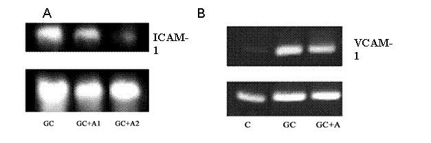 Mai intai s-a izolat ARN total utilizand kit special de microizolare (Glass Max RNA microisolation - spin cartridge system) bazat pe extractia ARN cu guanidinizotiocianat, mercaptoetanol si precipitare cu alcool etilic. Concentratia de ARN total extras s-a apreciat prin masurarea extinctiei la 260nm. ARN izolat a fost supus tehnicii RT-PCR. S-a utilizat kitul de reverstranscriere si amplificare intr-o singura etapa (one tube RT-PCR system ce contine revers transcriptaza AMV si Taq-ADN polimeraza). In reactia de amplificare s-au folosit urmatorii primeri specifici: pentru ICAM-1 sens :5'-GTCCCCCTCAAAAGTCATCC-3'si antisens: 5'-AACCCCATTCAGCGTCACCT-3', pentru VCAM-1 sens : 5'-ACCACAGGCTGTGAGTCC-3' si antisens: 5'-TGTGTCTCCTGTCTCCGC-3'. Reactia de RT-PCR a fost controlata prin utilizarea de primeri specifici pentru gliceraldehid-fosfatdehidrogenaza (GAPDH), sens: 5'-ACCACAGTCCATGCCATCAC-3'si antisens : 5'-TCCACCACCCTGTTGCTGTA-3'