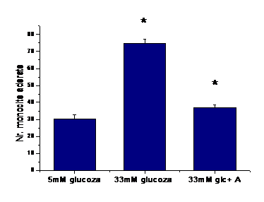 Rezultatele obtinute arata ca numarul monocitelor care adera la celulele endoteliale activate cu 33mM glucoza este crescut semnificativ fata de numarul monocitelor aderate la CE control. De asemenea, concentratia de 1mM aspirina reduce semnificativ adeziunea monocitelor la CE activate de glucoza (figura I.5).