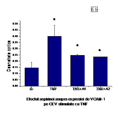 In urma stimularii CEV cu 50ng/ml TNF-a timp de 6 ore expresia de VCAM-1 a fost crescuta (figura I.6), dar redusa semnificativ de ambele concentratii de aspirina (0.5mM si 1mM).