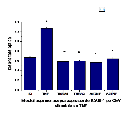 In figura I.7 se observa ca expresia moleculei de adeziune ICAM-1 a fost redusa cu aproximativ 50% de ambele concentratii de aspirina (A1=1M, A2=0.5mM) pe CEV stimulate timp de 6 ore cu TNF-a (50ng/ml). In cazul probelor A1TI si A2TI s-a facut o preincubare de 30 minute cu aspirina, urmata de activarea cu TNF-a